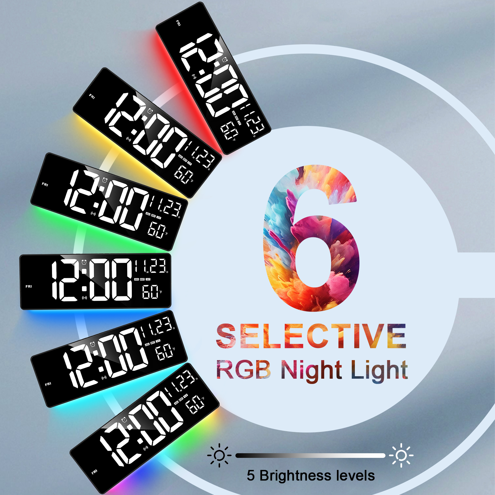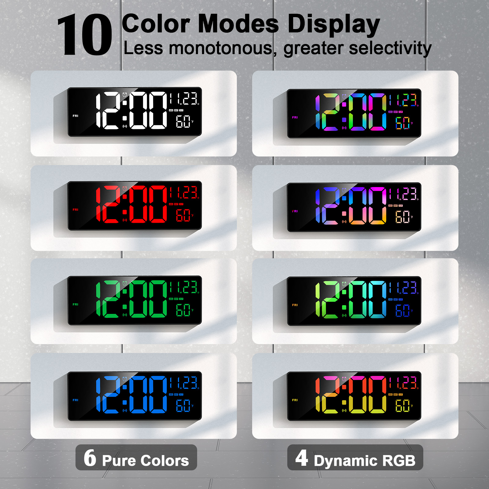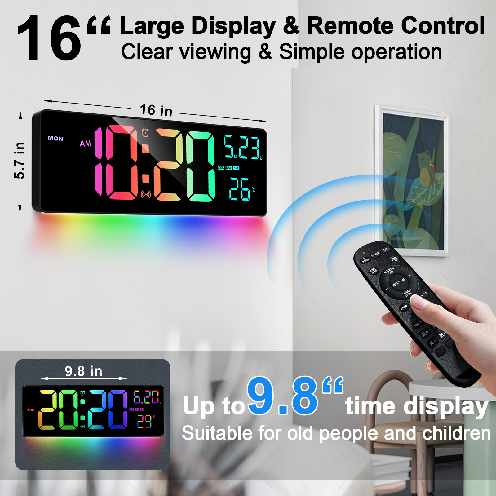 16" Bluetooth Large Digital Wall Clock/Auto Time Sync, 10 RGB Colors Digital Clock Large Display with Remote, Auto-Dimming/DST, Calendar, Timer, Alarm, 6 Night Lights Big Digital Clock for Decor - 副本